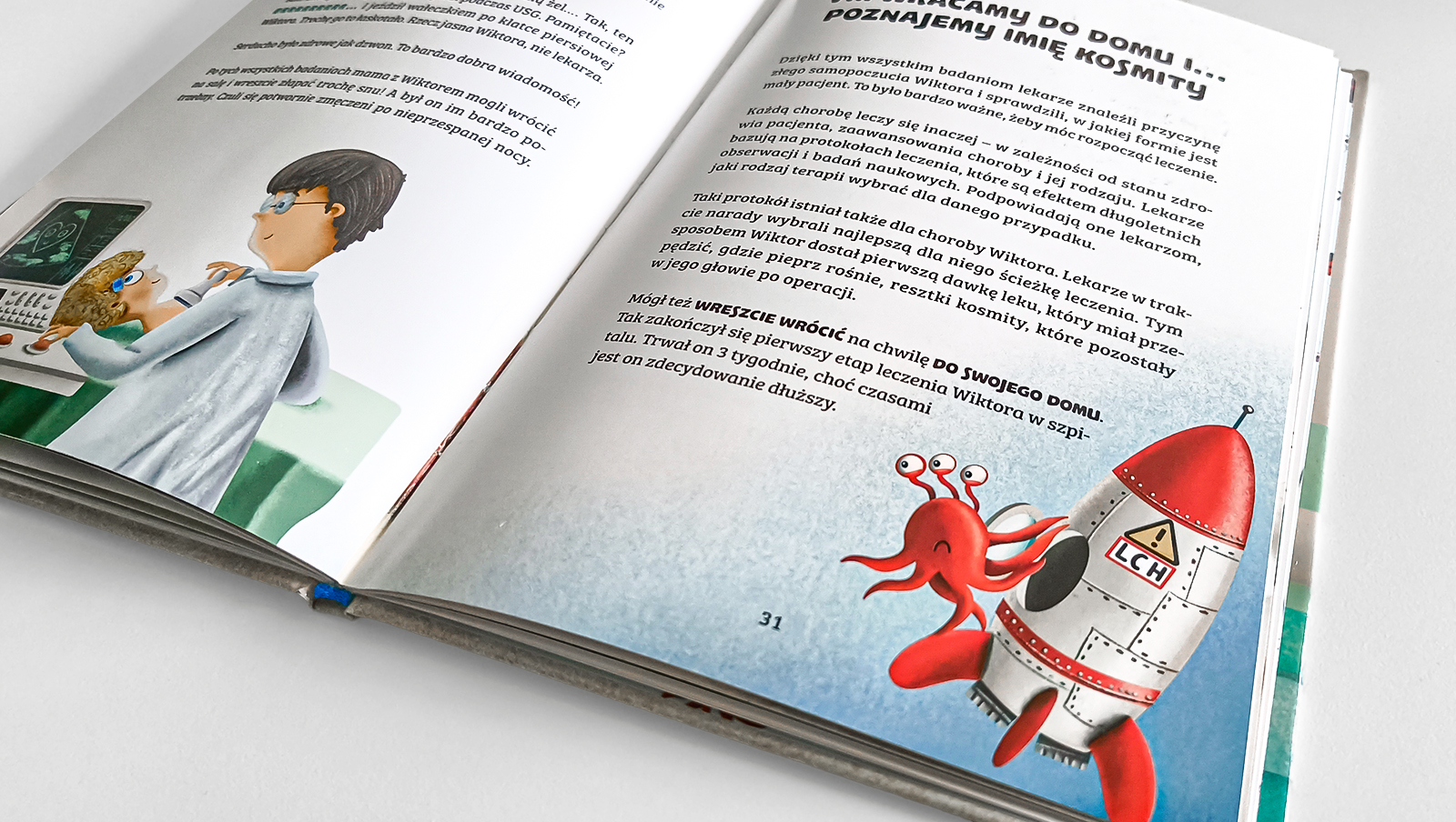 Przygody Wiktora, który kilka lat temu przeszedł leczenie onkologiczne, opowiedziane przez jego mamę Asię, pozwalają dzieciom i rodzicom poznać, zrozumieć i oswoić nową rzeczywistość. Mały chłopiec podczas pobytu w szpitalu oprócz miłych lekarzy, pielęgniarek i kolegów poznaje również nowe słowa, za którymi kryją się tajemnicze sprzęty, surowe zakazy oraz związane z nimi ciekawe anegdoty, czyli badania lekarskie. Mama Wiktora m.in. tłumaczy, jak nieprzyjemne może być badanie USG, jak wygląda tomografia i na czym polega badanie histopatologiczne. Opowiada też dlaczego jest tak trudno zważyć małego pacjenta, co wspólnego z krwią mają biedronki i co zjadają wenflonowe motyle.