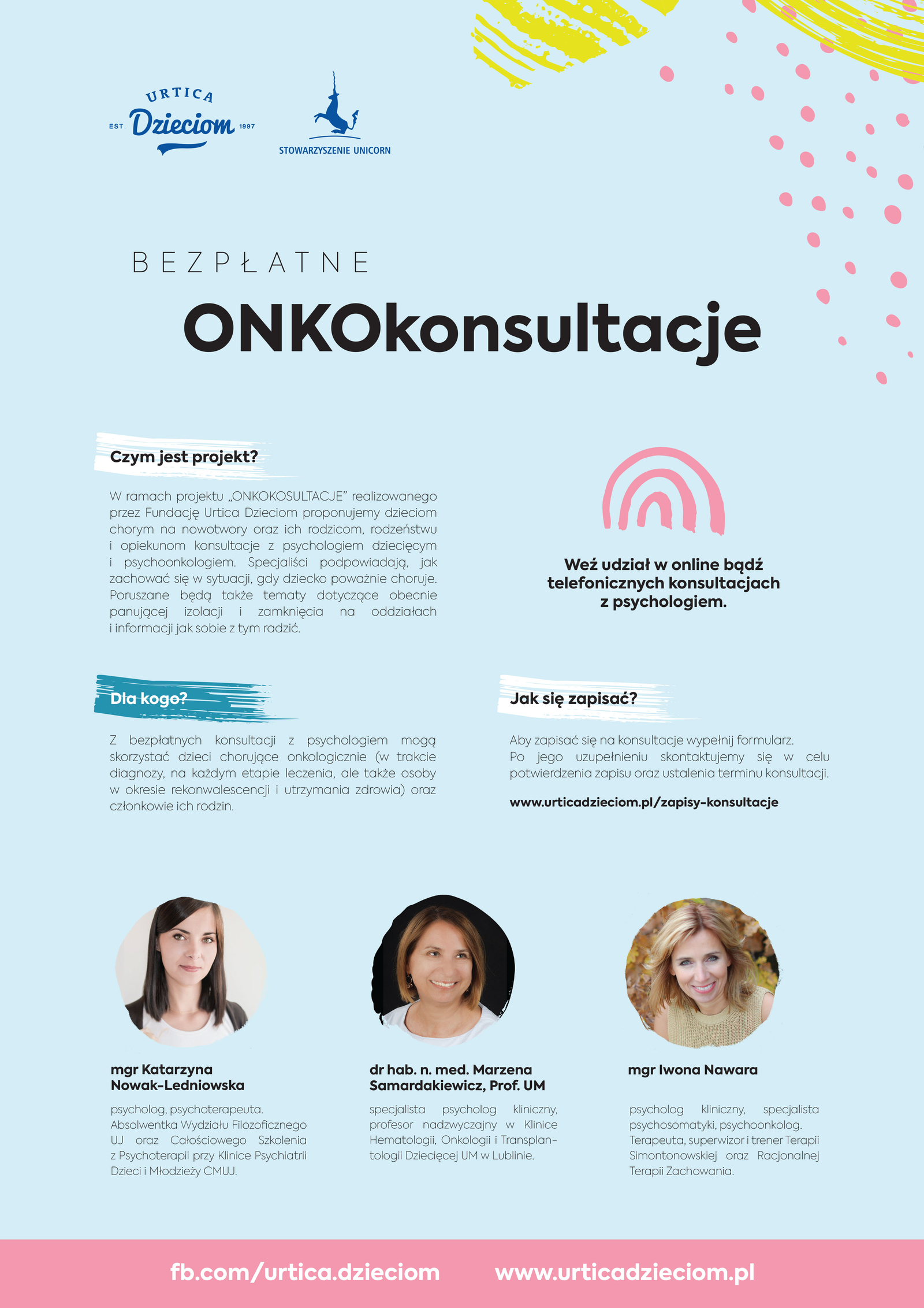 Sesje prowadzone będą przez specjalistów z Centrum Psychoonkologii UNICORN, które współorganizuje z Fundacją Urtica Dzieciom turnusy terapeutyczne „Urtica Dzieciom Camp”. I choć w tym roku wyjazdowe wakacje odbyć się nie mogą, organizatorzy nie zapomnieli o potrzebach swoich podopiecznych. Do dyspozycji będzie dwóch psychologów pracujących na co dzień z dorosłymi: mgr Iwona Nawara i mgr Katarzyna Nowak-Ledniowska oraz dr hab. n. med. Marzena Samardakiewicz, Prof. UM, wykwalifikowany psychoterapeuta dziecięcy.