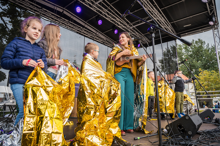 Złoty orszak zakończony „Złotą piosenką" – uczestnicy warsztatów muzycznych wraz z prowadzącą, Sylwią Lasok