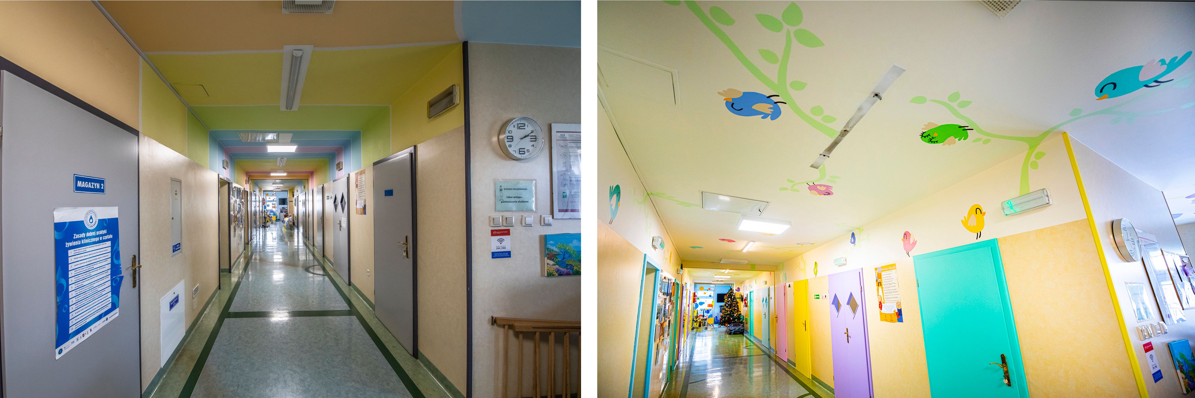 - malowanie i dekorowanie korytarza zewnętrznego prowadzącego do oddziału oraz przestrzeni samego oddziału: sal pacjentów, korytarza, aneksu pielęgniarskiego, gabinetu pielęgniarki oddziałowej,