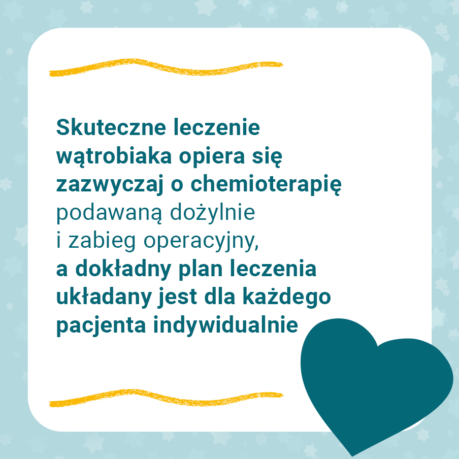 Skuteczne leczenie wątrobiaka opiera się zazwyczaj o chemioterapię podawaną dożylnie i zabieg operacyjny, a dokładny plan leczenia układany jest dla każdego pacjenta indywidualnie, w zależności m.in. od wielkości guza, możliwości jego usunięcia, obecności przerzutów, stężenia AFP i wieku dziecka.