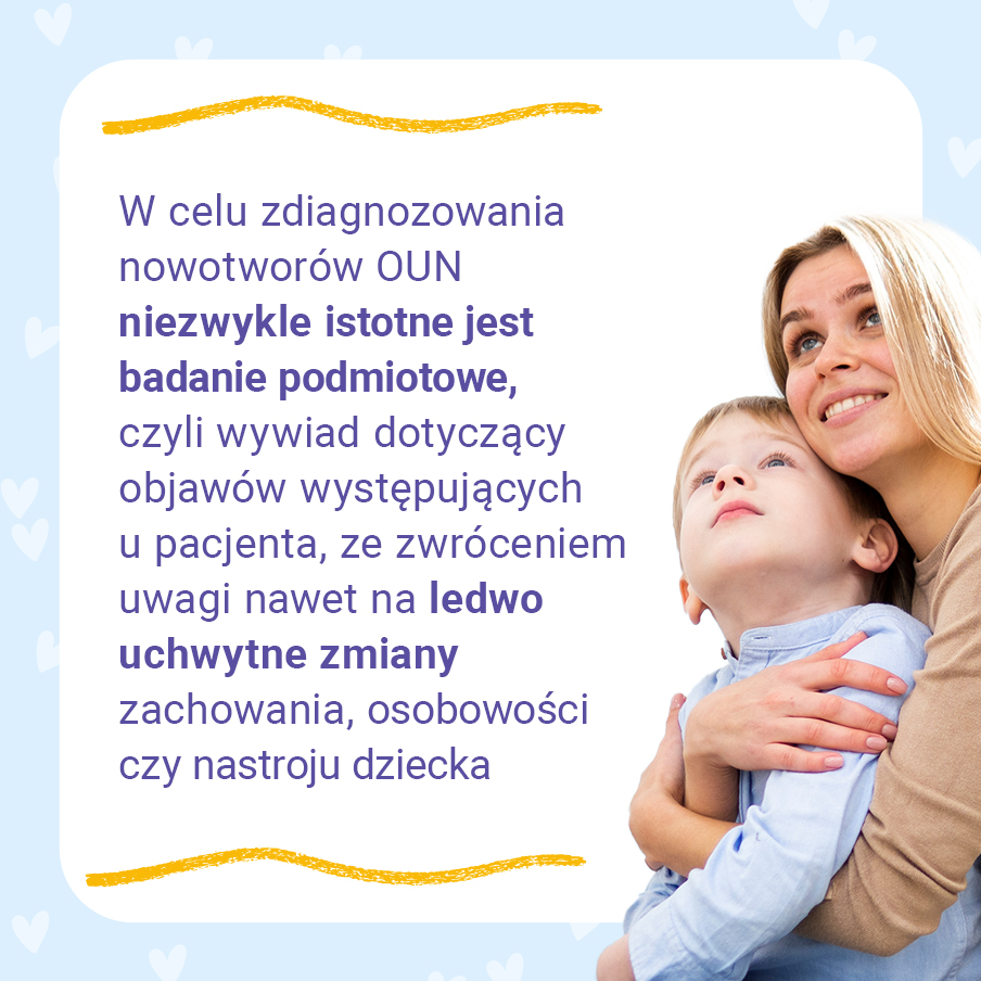 W celu zdiagnozowania nowotworów OUN niezwykle istotne jest badanie podmiotowe, czyli wywiad dotyczący objawów występujących u pacjenta, ze zwróceniem uwagi nawet na ledwo uchwytne zmiany zachowania, osobowości czy nastroju dziecka. Dodatkowo zazwyczaj sprawdzane są takie elementy, jak równowaga, koordynacja, czucie i odruchy. Wykonywane są badania diagnostyczne, takie jak:
