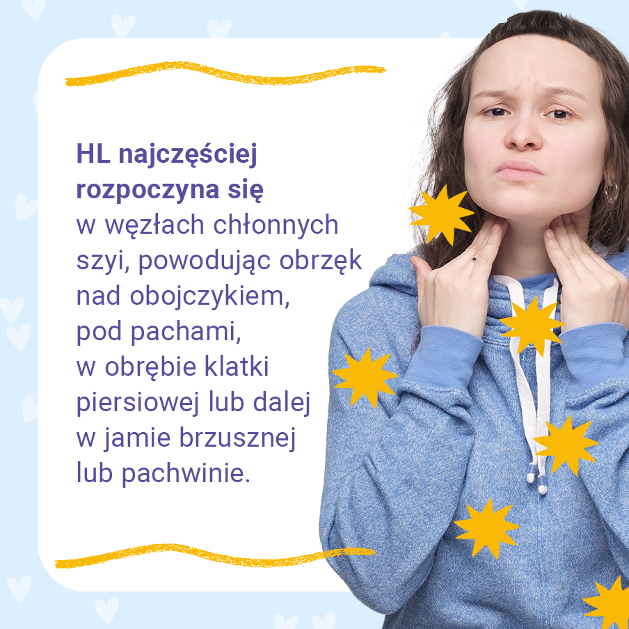 Pierwszym objawem HL jest zwykle bezbolesny obrzęk jednego lub grupy węzłów chłonnych, który utrzymuje się przez kilka tygodni lub nawet miesięcy. Chłoniaki mogą rozpocząć się w dowolnym miejscu w układzie chłonnym, ale HL najczęściej rozpoczyna się w węzłach chłonnych szyi, powodując obrzęk nad obojczykiem, pod pachami, w obrębie klatki piersiowej lub dalej w jamie brzusznej lub pachwinie. Jeśli zajęte zostaną węzły chłonne w klatce piersiowej, może to powodować kaszel i/lub duszności. Czasami u dziecka z HL występuje swędzenie skóry czy tzw. objawy B, tj. gorączka (>38°C) bez konkretnej przyczyny, poty nocne lub utrata >10% masy ciała w ciągu ostatnich 6 miesięcy.