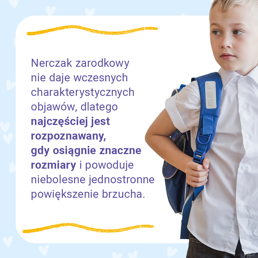 Nerczak zarodkowy, podobnie jak inne nowotwory występujące u dzieci, nie daje wczesnych charakterystycznych objawów, dlatego najczęściej jest rozpoznawany, gdy osiągnie znaczne rozmiary i powoduje niebolesne jednostronne powiększenie brzucha. Czasami można stwierdzić także obecność krwi w moczu lub podwyższone ciśnienie tętnicze krwi, jednak zazwyczaj rodzice nie zauważali wcześniej niepokojących objawów, a ich pociecha wydawała się być w pełni zdrowa.