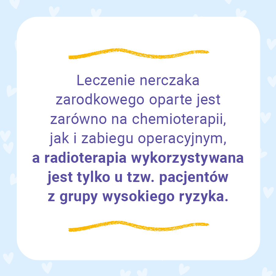Leczenie nerczaka zarodkowego oparte jest zarówno na chemioterapii, jak i zabiegu operacyjnym, a radioterapia wykorzystywana jest tylko u tzw. pacjentów z grupy wysokiego ryzyka. Zazwyczaj leczenie rozpoczyna się od podawanej dożylnie chemioterapii przedoperacyjnej, której zadaniem jest zmniejszenie guza. Wtedy w kolejnym etapie leczenia guz zostanie usunięty przez chirurga. W wielu sytuacjach możliwe jest wykonanie tzw. zabiegu nerkooszczędzającego, dzięki któremu usuwa się guz i część nerki jedynie przylegającą do niego. Niekiedy konieczne jest jednak usunięcie guza wraz z całą nerką – to tzw. nefrektomia. Warto pamiętać, iż życie z prawidłowo działającą jedną nerką u większości osób nie utrudnia codziennego funkcjonowania, ale długofalowo wymaga opieki nefrologicznej.