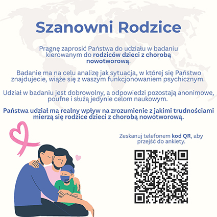 Udział w badaniu jest dobrowolny i całkowicie anonimowy, a zebrane dane zostaną wykorzystane wyłącznie do celów naukowych. Państwa zaangażowanie ma szansę przyczynić się do pogłębienia wiedzy na temat wyzwań, z jakimi mierzą się rodzice dzieci leczonych onkologicznie.