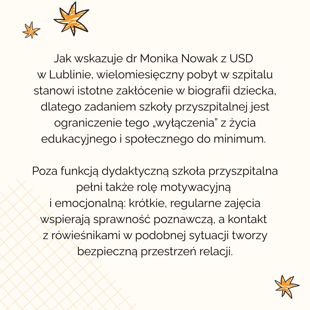 Jak podkreśla dr Monika Nowak, pedagog terapeutyczny z Oddziału Hematologii, Onkologii i Transplantologii USD w Lublinie, tymczasem to właśnie nauka, kontakt ze szkołą i rozwój poznawczy oraz emocjonalny dziecka stanowią ważne elementy jego dobrostanu w trakcie długiego leczenia.