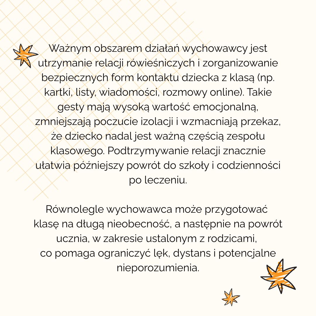 Istotnym obszarem działań wychowawcy jest utrzymanie relacji rówieśniczych i zorganizowanie bezpiecznych form kontaktu dziecka z klasą (np. kartki, listy, wiadomości, rozmowy online). Takie gesty mają wysoką wartość emocjonalną, zmniejszają poczucie izolacji i wzmacniają przekaz, że dziecko nadal jest ważną częścią zespołu klasowego. Równolegle wychowawca może przygotować klasę na długą nieobecność, a następnie na powrót ucznia, w zakresie ustalonym z rodzicami, co pomaga ograniczyć lęk, dystans i nieporozumienia.